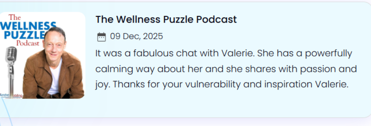 As a voice for conscious living and authentic leadership, Valerie shares grounded, heart-centered insights that bridge spirituality and daily life. Her message, that healing is an adventure and authenticity is the compass, resonates deeply across podcasts, panels, and publications.
